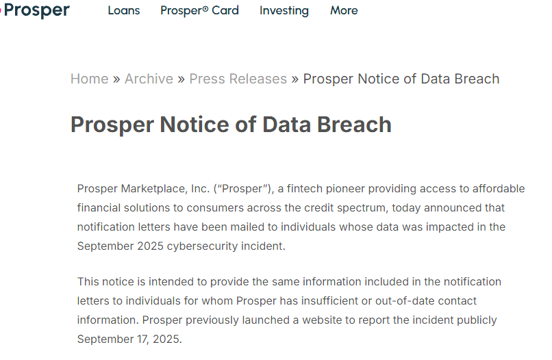 data has probably been stolen: Although the breach occurred over the time span of June through August 2025, the data that included in the breach could have been much older. Prosper does not say how far back the exposed applicant data goes. It is a fact that many financial firms retain application data for years for compliance reasons. So, if you had ever done one of the following, your data could well be included in the breach.