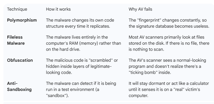 Assuming that all data files are saved and then backed up to an external drive, power down the computer. When the computer starts back up, reconnect to the network by repeating the steps above. After you shutdown and reboot, and then reconnect to the network, if everything is OK, you can use the browser History list to reload any legitimate webpages that were lost when Task Manager forced closed them. If the scareware returns, then most likely the PC is infected. If the scareware does not return, maybe you dodged a bullet. 4. Why not just run antivirus software? Antivirus software can certainly prove that a computer IS infected. On the other hand, AV software cannot prove definitely that the computer IS NOT infected. Running AV software most effectively is more complicated than simply clicking "RUN." AV software is really most effective when run with Windows in Safe Mode. When a Windows PC is in Safe Mode, only those most essential processes needed for Windows itself to run start up, and that excludes the malware itself. In Windows 11, a different and more complicated start up routine is required to enable Safe Mode and is beyond the scope of this tutorial. Furthermore, to be effective, AV software relies on what are known as "signature files." The signature file updates the AV software to detect known new strains of malware. If the signature file does not contain a fix for a newly discovered strain of malware, then that malware will continue to plague any system it had infected. Also, modern malware often employs several evasion techniques to avoid detection. The chart below complied by the Google Gemini AI summarizes some of the more common evasion techniques.