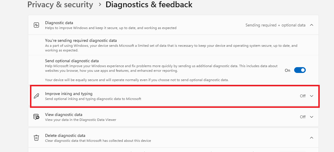 One more dataset Microsoft collects on users is Diagnostic data. It has been said that this feature can also be a security risk. Microsoft, however, says something different about Diagnostic data. "Microsoft uses diagnostic data to keep our products secure and up to date, troubleshoot problems, and make product improvements..." This information that Microsoft collects helps Microsoft better understand the circumstances surrounding system crashes and other technical issues. One aspect of this dataset Microsoft collects is intended to help recognize errors in what you type. The Improve inking and typing feature sends information to Microsoft about what you type.