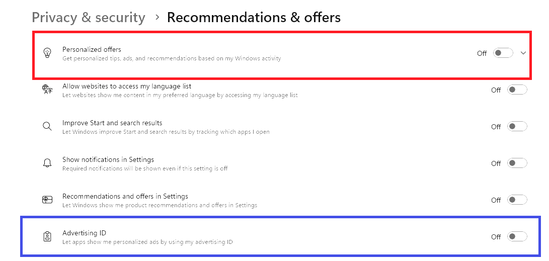 Next, users may wish to control how Microsoft collects information on how they use their computers; what websites are visited; or even what type of products have been purchased while online. This is can be accomplished by turning off a users Advertising ID. As Microsoft explains this: Windows generates a unique advertising ID for each user on a device, which app developers and advertising networks can then use for their own purposes, including providing more relevant advertising in apps. When the advertising ID is enabled, apps can access and use it in much the same way that websites can access and use a unique identifier stored in a cookie. Turning off all the features that push offers at you may not reduce the number of ads that you may see, as all the steps in the previous section will do. The ads that a user does see might seem less intrusive. As for myself, I find it very unnerving when the computer seems aware of something I have looked at or shopped for, and then tells me wouldn't I also like one of these widgets, too?