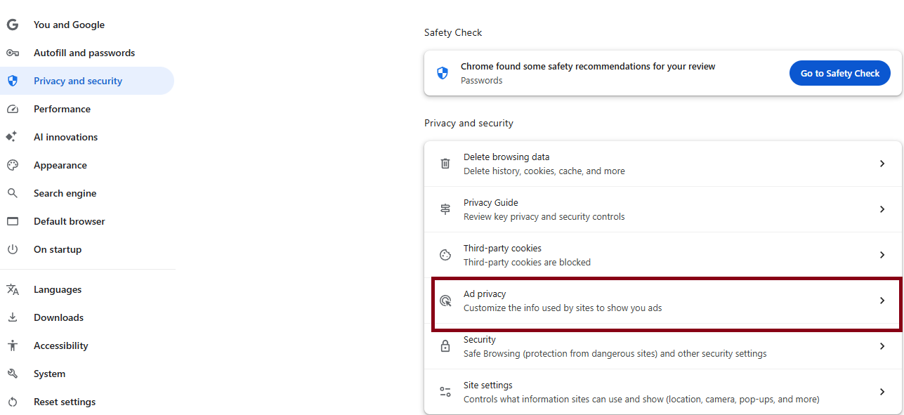 Google Chrome, go to Chrome Settings. Click Privacy and security
